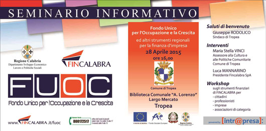 Nella splendida cornice della perla della Costa degli Dei, 28 aprile alle ore 16 nella Biblioteca Comunale, l'Amminsitrazione Comunale di Tropea e Fincalabra hanno organizzato un seminario informativo sugli strumenti che Fincalabra gestisce a sostegno dell'occupazione e dello sviluppo d'impresa.