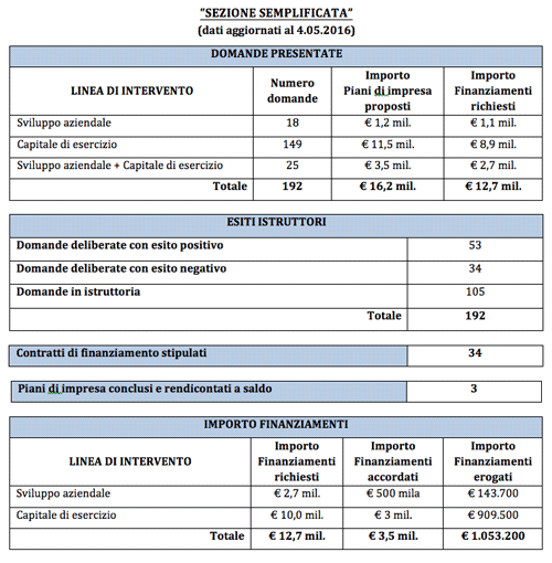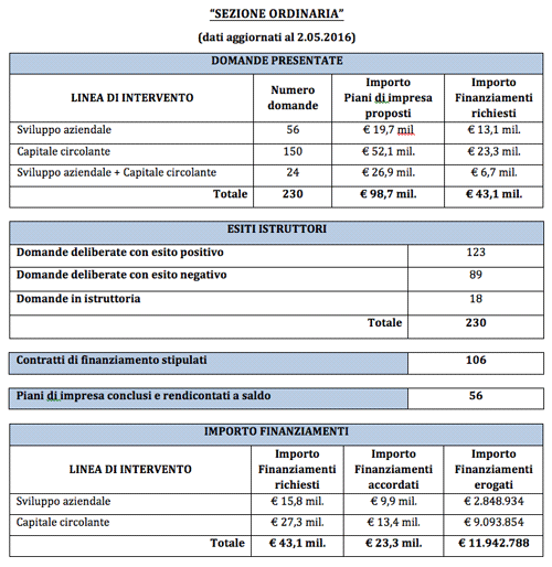Il “Fondo Rafforzamento Imprese Esistenti”, avente una dotazione finanziaria complessivamente pari ad € 27.359.000, e con scadenza prevista al 31.10.2016 quale data di ultimazione dei piani di impresa, risulta attualmente impegnato (Sezione Ordinaria + Sezione Semplificata) per un importo complessivo pari a circa € 26,7 milioni, e con finanziamenti accordati in favore di n. 176 imprese.